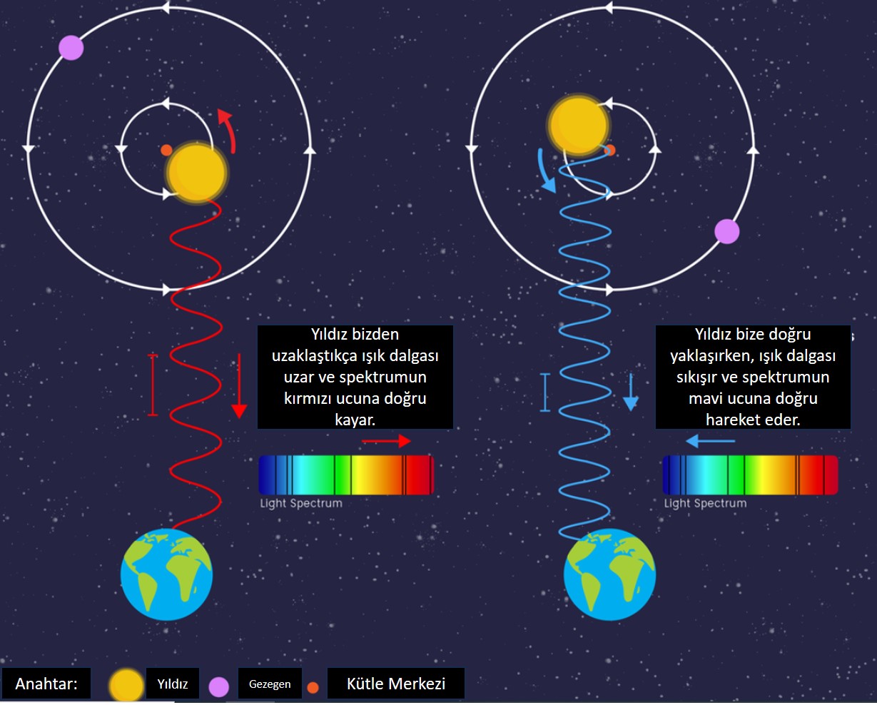 Durum aslında, gezegen ve yıldız ortak kütle merkezlerinin etrafında dönmesinden ibarettir. Yıldızın kütlesi gezegenlerden çok daha büyük olduğu için, bu iki veya diğer cisimlerle birlikte kütle merkezi yıldızın içinde ya da yıldıza çok yakın bir yere denk gelir. İşte bu nedenle de gezegen yıldızın etrafında dönerken yıldız da hafifçe sallanır gibi görünür. Astronomlar, spektroskopi kullanarak bu yalpalanmayı ölçebilirler. Bir yıldız bize doğru hareket ediyorsa, ışığı maviye kaymış gibi görünür ve uzaklaşıyorsa ışığı kırmızıya kaymış gibi görünür. Spektroskopi, yıldız-gezegen sisteminin kütle merkezinin etrafında dönen bir yıldızın bize doğru ve uzaklaşırken renginde meydana gelen bu değişikliği gösterebilir.
