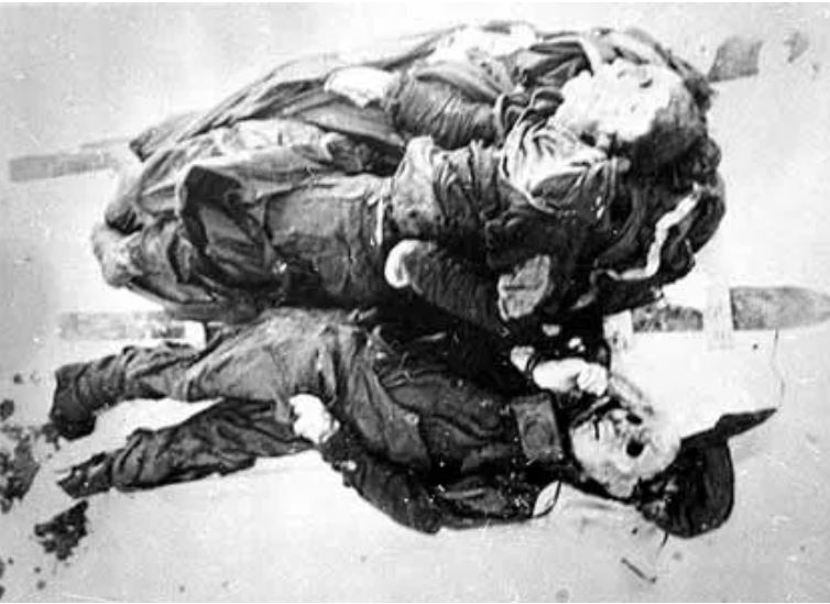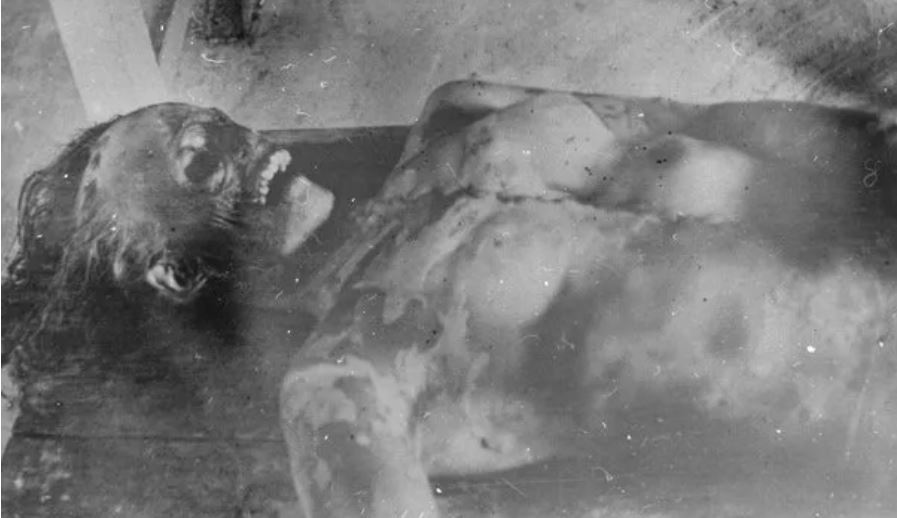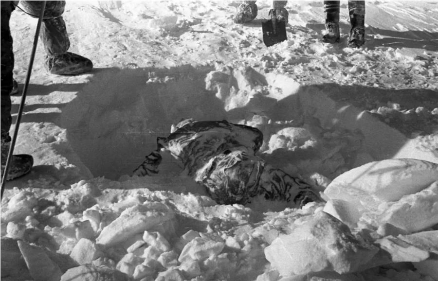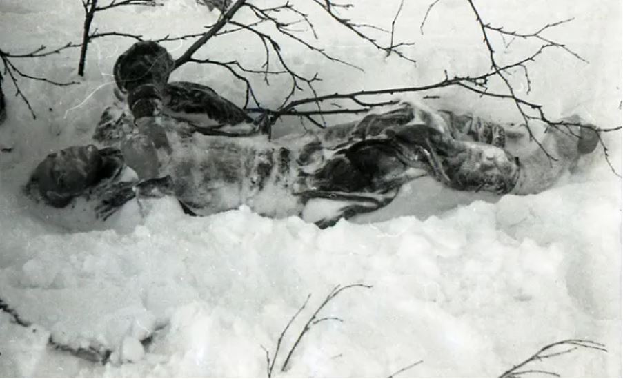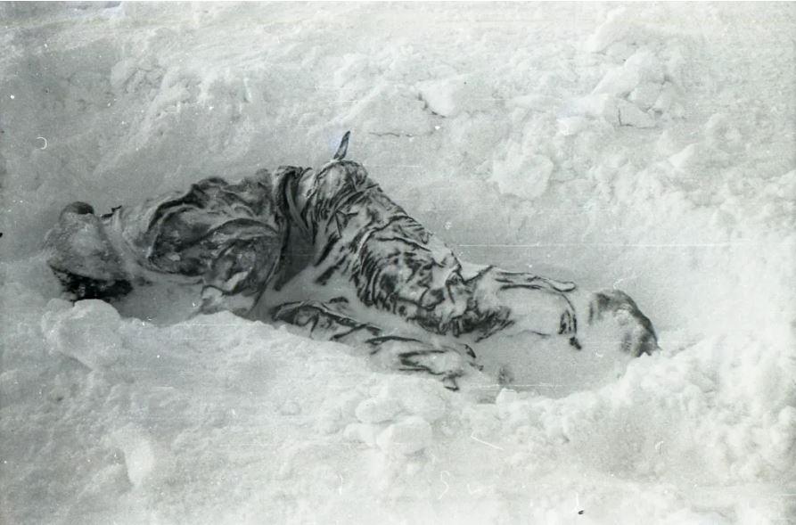 Kolevatov ve Zolotaryov'un cesetleri. Semyon Zolotaryov'un boynundaki fotoğraf makinesine dikkat edin. Ayrıca bir elinde kalem, diğerinde küçük bir not defteri tutarken bulundu, ancak bir şey yazamadan öldü.