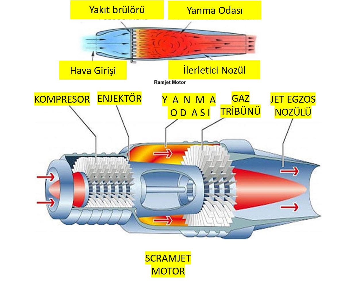Geleneksel jet motorlarının aksine, scramjetlerde dönen parça yoktur. Normal jet motorlarında dönen kanatlar havayı sıkıştırır ve hava akışı ses hızının altında kalır.