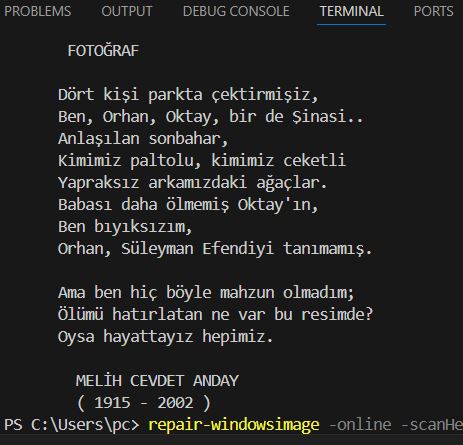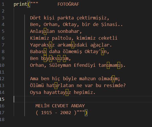 Aşağıda tek print komutuyla çok satırlı bir şiiri kopyala yapıştır ile alıp gerekli düzenlemeleri yaptım.