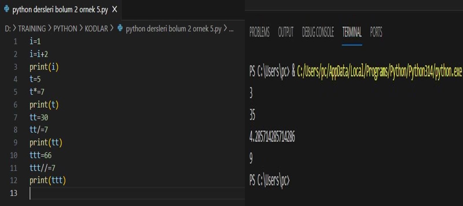 Bir de kalansız bölmeli işlem yapıp aynı değişkene atayalım. (10, 11 ve 12. Satırlar) ttt=66 olsun. ttt//=7 işlemiyle 66 sayısını kalansız olarak 7’ye böl ve değeri ttt değişkenine ata diyoruz. Sonuç 9